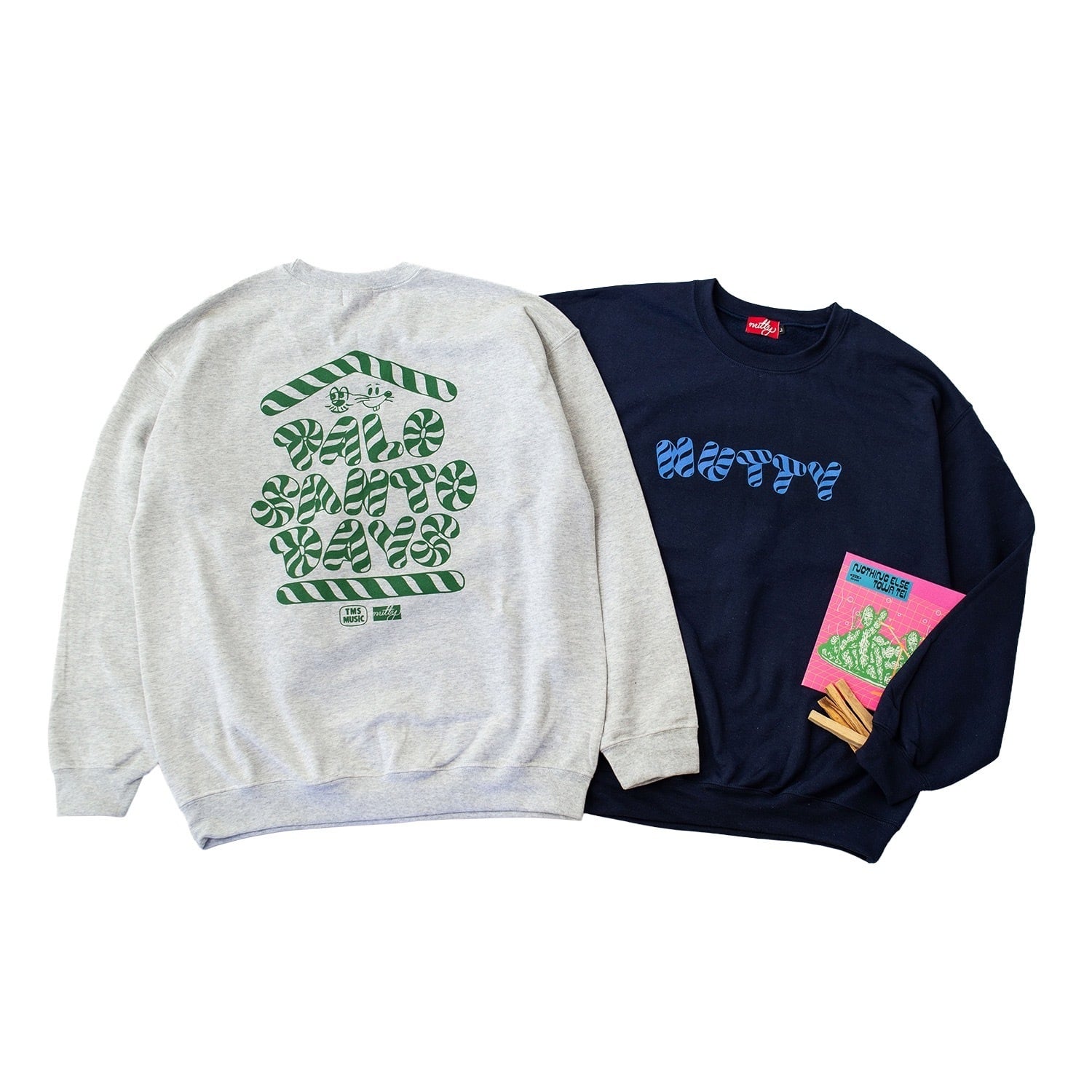 独自のゆるやかな視点で VINYL、TAPE、MIX CD などの作品をリリースし、スーベニア的なアパレルやグッズ制作、レコード販売などさまざまな展開を広げる音楽レーベル “TMS” と 多様なカルチャーやライフスタイルから得たインスピレーションをプロダクトへ落とし込み、日々生まれるアイディアをかたちにするクリエイティブブランド "nuttyclothing" によるコラボレーションスウェットが完成しました。