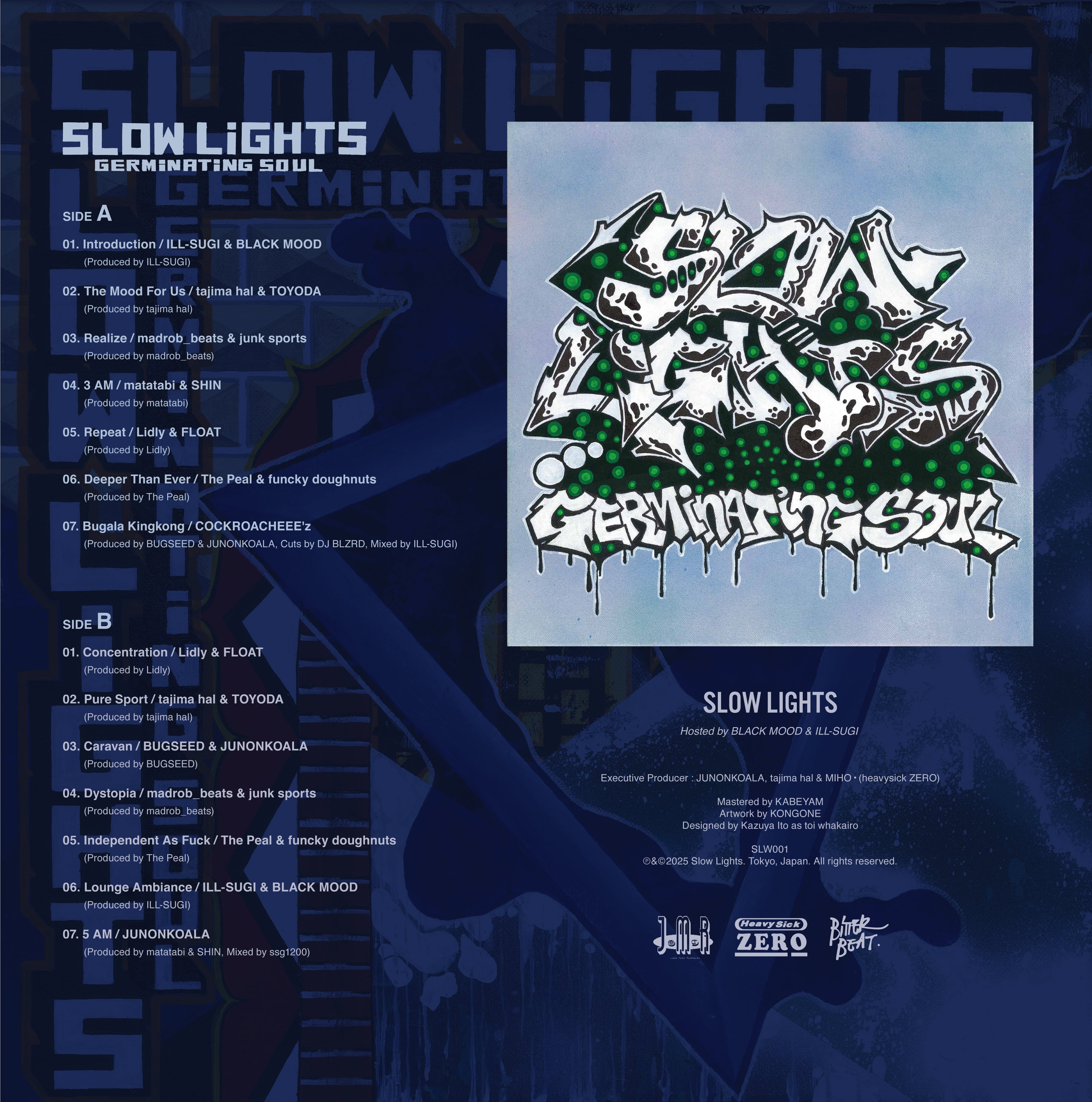 『中野 heavysick ZERO で開催されているイベント「SLOW LIGHTS」に参加するビートメイカーとDJがそれぞれ1組ずつタッグを組み、さらにMCを迎えて新たな楽曲を制作するという独自のコンセプトによるコンピレーション作品が限定アナログ盤 (LP)でリリース!』